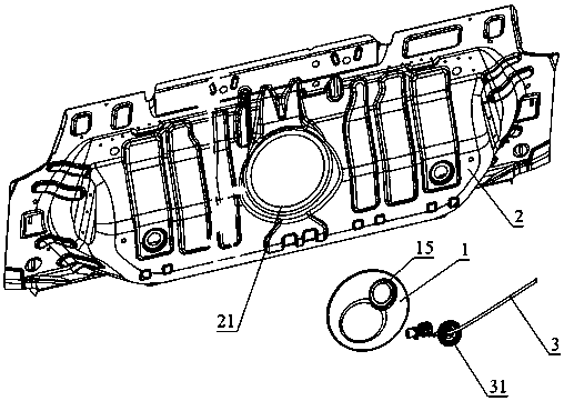 技术领域 本实用新型涉及轿车内饰件,具体涉及油箱检修盖板。 背景技术 油箱检修盖板是汽车内饰件中的基本配置,它能密封油箱检修口,避免油箱不需 要检修时汽油异味泄漏进乘员舱。目前主流的油箱检修盖板与钣金装配方式为采用丁基胶 粘接,这种方式密封性良好但维修困难。由于丁基胶粘接性较强,拆卸检修盖板费时费力, 且丁基胶容易粘到维修人员手上及车内其他位置,不易清理。 实用新型内容 本实用新型提出一种油箱检修盖板,可以既保证油箱检修盖板与钣金密封性良 好,同时拆装方便、省时省力,降低成本。 为解决上述技术问题,本实用新型采取下述技术方案。 一种油箱检修盖板,包括盖板本体,盖板本体上有供线束通过的圆孔,圆孔内圈装 配有橡胶套。其改进在于,在盖板本体周边一体成型有至少两个与钣金卡接的卡子,这种采 用自生卡子与钣金卡接的方式装配,拆装方便,省时省力,节约丁基胶等辅料。 进一步,所述卡子外侧设有一圈密封条,当检修盖板装配到位后,密封条在钣金与 检修盖板之间起到密封作用。 进一步,所述卡子在盖板本体周边均应分布,更优的是,所述盖板本体为圆形,卡 子均匀分布四个,均匀分布的卡子能保证检修盖板与钣金装配受力平衡、可靠。 进一步,所述盖板本体内侧有竖向加强筋,既能够起到加强作用同时能在装配时 起很好的导向作用,避免装配操作困难、卡子断裂等问题。 本实用新型具有拆装方便、省时省力,密封性强、降低成本等优点。 附图说明 图1A和图1B是油箱检修盖板的正面和背面结构示意图。 图2是油箱检修盖板的装配方式示意图。 图3是油箱检修盖板与钣金配合的断面示意图。 图中,1- 盖板本体,11-卡子,12-圆孔,13-加强筋,2-后地板钣金,21-钣金孔,3- 线束,4-橡胶套,5-密封条。 具体实施方式 以下结合附图进一步说明本实用新型的结构: 如图1A和图1B所示,油箱检修盖板包括圆形的盖板本体1,盖板本体1的外周均匀 设置有四个卡子11,保证检修盖板与钣金装配受力平衡、可靠,卡子是与盖板本体1一体成 型,具有一定弹性,拆装方便,结构简单。卡子的外侧设有一圈密封条5,增强密封效果。盖板 本体上开有供线束通过的圆孔12,圆孔内圈装配有橡胶套4。盖板本体内侧有竖向加强筋 13,在装配时起很好的导向作用,避免装配操作困难、卡子断裂等问题。 如图2所示,装配时,首先将线束3上的橡胶套4装配到盖板本体1上的圆孔12上,确 保橡胶套4与检修盖板圆孔12配合良好无间隙。然后将盖板本体1装配到后地板钣金孔21 上,装配时首先将盖板本体1对准后地板钣金孔21,然后依次按压四个卡子11,保证卡子完 全与后地板钣金孔21卡接到位。 安装完成后,盖板本体1与后地板钣金2的卡接结构断面如图3所示,油箱检修盖板 的翻边与钣金贴合良好,且油箱检修盖板内部周圈密封条5在盖板本体1和后地板钣金2之 前起到很好的密封作用。拆卸油箱检修盖板只需要依次将四个卡子11从后地板钣金孔21中 撬出即可。 一种油箱检修盖板