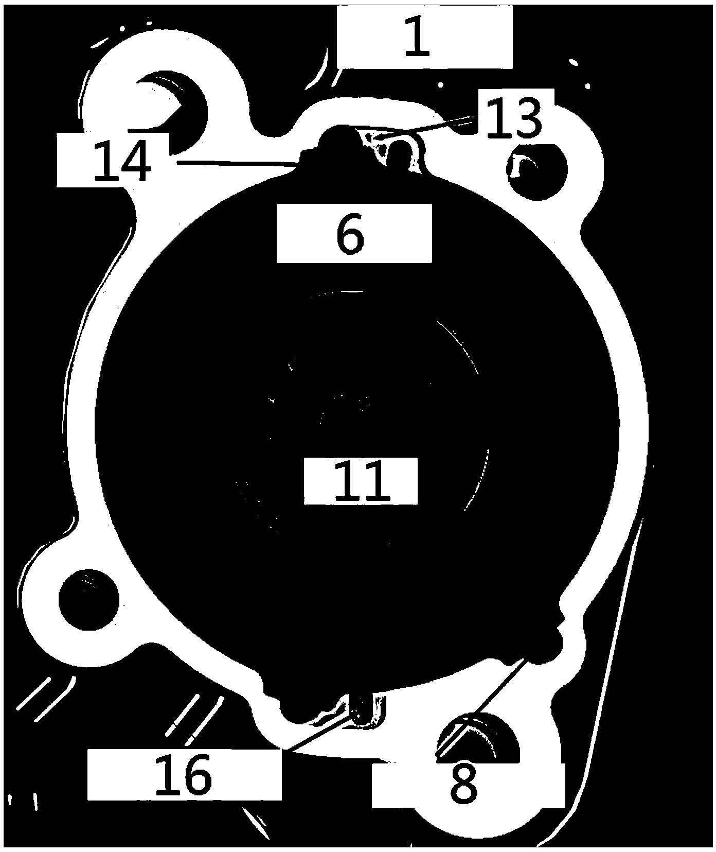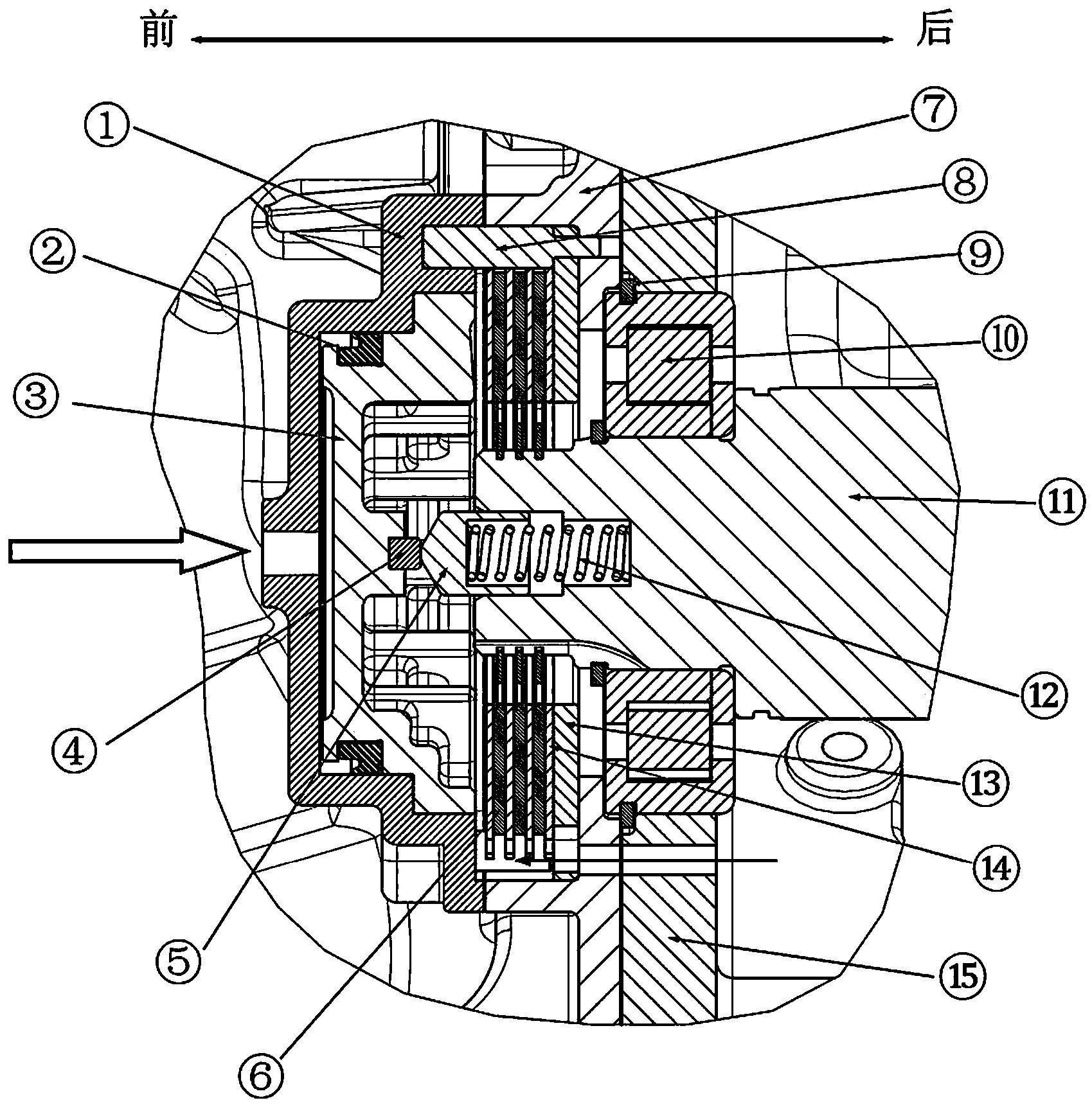 技术领域 本发明涉及变速箱加工设计领域,具体涉及一种AMT中间轴制动结构。 背景技术 机械式自动变速箱(Automatic Mechanical Transmission,简称AMT)是在传统手 动变速箱的基础上通过电控单元来实现离合器的分离结合以及选换挡等操作。 AMT在换挡时需要主箱内二轴与中间轴转速进行同步,而在升挡过程中,需要对二 轴进行制动,以期在最短的时间内使中间轴转速达到目标转速,完成转速同步并换挡。当前 应用于AMT变速箱制动器(Transmission Brake,简称TB)的结构普遍为两种,一种是在变速 箱壳体外部使用制动器结构,另一种是在离合器壳体内的中间轴轴端对中间轴进行制动。 普通的AMT中间轴制动器结构都是通过在变速箱壳体外部加装独立的变速器制动 器结构,这种结构体积较大,且装在变速箱底部,工作环境比较恶劣,容易因外部环境的变 化而引起故障。为了尽可能减少因外部因素导致的TB结构故障引起整个AMT出现故障,需要 开发一款设置在离合器壳体内部的AMT中间轴轴头制动结构,通过在中间轴轴头加装制动 器可以有效利用离合器壳体内的空间,减轻制动器的质量同时提高产品工作可靠性。 发明内容 本发明的目的在于针对上述现有技术中的问题,提供一种AMT中间轴制动结构,通 过在中间轴的轴头加装制动盘和摩擦盘,依靠二者摩擦产生的扭矩降低中间轴转速,实现 换挡。 为了实现上述目的,本发明采用的技术方案为:包括由变速器壳体向离合器壳体 前端盖延伸的中间轴,中间轴延伸部分的外周上间隔设置有若干个随轴转动的摩擦盘,摩 擦盘之间设置有不随轴转动的制动盘,离合器壳体前端盖的内部密封设置活塞且离合器壳 体前端盖上开设有制动气流入口,活塞的中心通过压缩弹簧与中间轴的轴心连接,所述的 活塞在气压作用下克服压缩弹簧的弹力推动制动盘的一端与摩擦盘进行结合,依靠二者摩 擦产生的扭矩降低中间轴的转速,通过中间轴转速传感器将采集到的转速信号反馈给变速 器控制单元,当中间轴转速达到目标转速范围后,中间轴制动解除并进行换挡。 所述中间轴的延伸部分与摩擦盘之间通过内外匹配的渐开线花键进行连接。 变速器壳体与离合器壳体上均开有两个润滑油孔,下方的润滑油孔用于变速箱内 的润滑油进入制动结构,摩擦盘在转动的时候将润滑油甩到上方,通过上方的润滑油孔排 出。 制动盘的外周向外延伸加工多个卡槽,在制动盘相对于摩擦盘挤压方向的外侧设 置压盖,压盖的外侧设有止推环;卡槽上设置销子,销子的一端固定在离合器壳体前端盖 上,另一端穿过压盖固定在离合器壳体上,制动盘在销子与离合器壳体的共同限位作用下 不随轴转动。 所述的活塞依次通过顶销和顶帽与压缩弹簧相接,顶帽上开设有弹簧安装孔,中 间轴的端部开设有阶梯孔,压缩弹簧设置在弹簧安装孔与阶梯孔的内部孔之间,阶梯孔的 外部孔大小与顶帽匹配,顶帽能够在外部孔的长度范围内前后移动。 制动气流入口经过空气滤清器与变速箱制动器电磁阀连接储气罐,当变速箱需要 升挡时,自动变速箱控制单元打开变速箱制动器电磁阀,进而使制动气流进入制动结构的 内部。 所述的变速器壳体上加工有制动气流通道,制动气流经过制动气流通道及铜气管 通入制动气流入口。所述的活塞与离合器壳体前端盖的内壁面之间通过K型密封圈进行密 封。 与现有技术相比,本发明具有如下的有益效果:通过延长中间轴靠近离合器壳体 的一端,中间轴延伸部分的外周上间隔设置有若干个随轴转动的摩擦盘,摩擦盘之间设置 有不随轴转动的制动盘,工作时通过外部气源驱动活塞气缸结构,活塞在气压作用下克服 压缩弹簧的弹力推动制动盘的一端与摩擦盘进行结合,依靠二者摩擦产生的扭矩降低中间 轴的转速,当中间轴转速达到目标转速范围后可进行换挡。本发明充分利用了变速器壳体 的内部空间,相比于原制动器结构具有质量轻、受外部因素影响小等特点,因变速箱壳体外 少了原AMT变速箱制动器结构,这样有利于主机厂匹配AMT时的布置和推广,丰富AMT产品的 技术储备。 进一步的,本发明在离合器壳体改动相对较小的情况下,由于中间轴靠近离合器 壳体一端的空间有限,要考虑使用该机构之后不能影响离合器正常的分离结合,因此对结 构的布置有比较严苛的要求。另外,在进行中间轴制动时,摩擦盘和制动盘相互摩擦会产生 大量的热量,在狭小的空间范围内,如果散热不够及时,则可能导致油温过高而使摩擦盘效 率降低,无法及时满足中间轴转速降低的要求,延长换挡时间。因此,本发明变速器壳体上 开有两个润滑油孔,通过下方的润滑油孔使变速箱内的润滑油进入制动结构,摩擦盘在转 动的时候将润滑油甩到上方,通过上方的润滑油孔排出,省去了独立的油泵。 附图说明 图1本发明的整体结构装配示意图; 图2本发明的整体结构拆分爆炸图; 图3本发明离合器壳体的改装示意图; 图4本发明的装配结构正面示意图; 图5本发明的工作原理框图; 附图中:1-离合器壳体前端盖;2-K型密封圈;3-活塞;4-顶销;5-顶帽;6-摩擦盘; 7-离合器壳体;8-销子;9-止推环;10-轴承;11-中间轴;12-压缩弹簧;13-压盖;14-制动盘; 15-变速器壳体;16-润滑油孔。 具体实施方式 下面结合附图对本发明做进一步的详细说明。 参见图1-2,本发明AMT中间轴制动结构包括由变速器壳体15向离合器壳体前端盖 1延伸的中间轴11,中