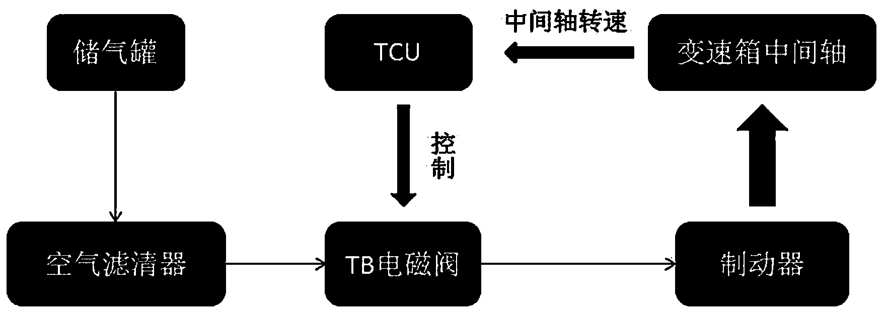 一种AMT中间轴制动结构,包括由变速器壳体向离合器壳体前端盖延伸的中间轴,中间轴延伸部分的外周上间隔设置有若干个随轴转动的摩擦盘,摩擦盘之间设置有不随轴转动的制动盘,离合器壳体前端盖的内部密封设置活塞且离合器壳体前端盖上开设有制动气流入口,活塞的中心通过压缩弹簧与中间轴的轴心连接,活塞在气压作用下克服压缩弹簧的弹力推动制动盘的一端与摩擦盘进行结合,依靠二者摩擦产生的扭矩降低中间轴的转速,通过中间轴转速传感器将采集到的转速信号反馈给变速器控制单元,当中间轴转速达到目标转速范围后,中间轴制动解除并进行换挡。本发明充分利用了变速器壳体的内部空间,具有质量轻、受外部因素影响小等特点。