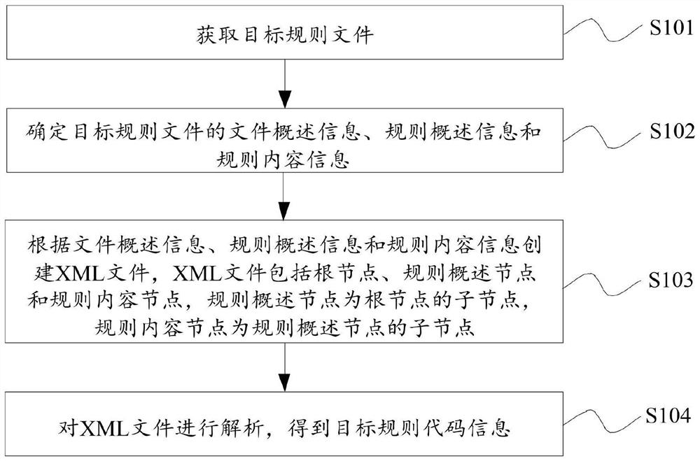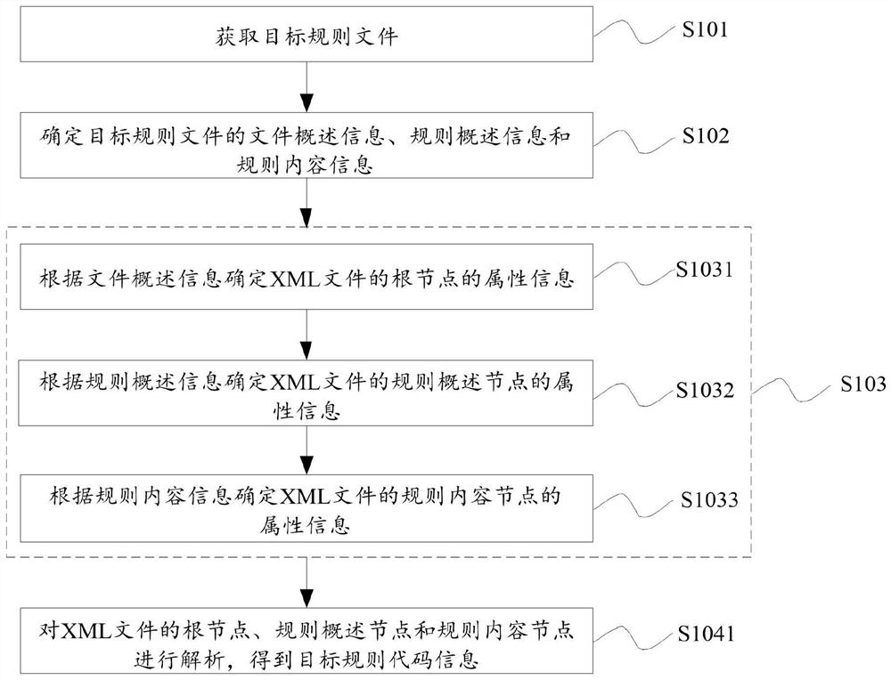 在一种可能的实现方式中,步骤S104包括步骤S1041:对XML文件的根节点、规则概述节点和规则内容节点进行解析,得到目标规则代码信息。