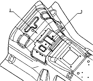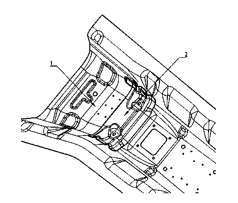 技术领域 本发明涉及汽车车身安全领域,具体涉及一种汽车安全气囊控制器安装结构。 背景技术 目前,有的车型配置有安全气囊,其安全气囊控制器(ECU)一般都安装于前壁板上或其他强度较好、振动较弱位置。该结构需要在前壁板上焊接一个支架,用于安全气囊控制器的安装。此种安装方式一般支架结构较复杂,制作难度较大,且局限于汽车驾驶室的布置空间,装配不便,在维修车辆过程拆装仪表台板时容易导致安全气囊失效,严重影响其可靠性能,直接影响驾驶员及乘员安全。因此,需要寻求另外的安全气囊控制器安装途径。汽车前地板中央通道是一个可选择的部位。而现有的汽车前地板中央通道结构一般是由两根分段式或贯通式横梁与地板搭接,再与车架纵梁相连接进行加强。汽车行驶过程中,地面作用于车辆的力通过轮胎、车架纵梁、地板横梁会传递到地板中央通道,在颠簸路面,地板中央通道处振动较强,若安全气囊控制器直接安装于中央通道上方,会导致振动较强,安全气囊控制器采集信号受到干扰而不准确,影响安全气囊正常的使用功能,并且可能造成安全事故。因此,还需要进一步对安装结构提出优选的技术方案。 发明内容 本发明的目的是提供一种汽车安全气囊控制器安装结构,其能使汽车安全气囊控制器在复杂路面及各种工况下行驶时准确采集信号,提高可靠性,保证乘客安全;还能优化汽车前部布置空间,使驾驶舱空间更通畅,维修方便。 本发明所述的一种汽车安全气囊控制器安装结构,包括定位连接在前地板中央通道中段下面的加强件和定位连接在前地板中央通道中段上面的安装支架,安装支架与加强件相对应,其特征是:汽车安全气囊控制器安装在所述安装支架上。 所述的一种汽车安全气囊控制器安装结构,其所述加强件为冲压成型的钣金件,其上设有一个圆形焊接定位孔、一个条形焊接定位孔、一贯通加强筋和两小段加强筋;所述加强件焊接在前地板中央通道中段的下面。 所述的一种汽车安全气囊控制器安装结构,其所述安装支架为冲压成型的钣金件,由一安装面和连接在该安装面的一侧边并向下弯折地搭接边构成;在所述安装面上设有两安装孔,在所述安装面焊接有两个分别与两个安装孔对应的凸焊螺母,两个凸焊螺母用于安装汽车安全气囊控制器。 进一步,在所述安装面上还设有一条下凹加强筋和一沉台。下凹加强筋和沉台均起增加强度作用。 本发明的有益效果:本方案对地板中央通道结构进行了加强,在地板中央通道下部增加一加强件,在前地板中部上方增加一安全气囊控制器安装支架,汽车安全气囊ECU控制器安装于地板中通道上方,经过CAE模拟分析及安装气囊控制器信号采集试验验证,该方案能够有效提升地板中央通道局部模态,减小前地板中通道的振幅及振动频率,试验表明在0-500Hz(汽车正常使用一般低于500Hz)范围内,作用于安装气囊控制器上X方向、Y方向振幅均处于可接受范围内。这样,在复杂路面及各种工况行驶时,控制器均能够准确采集信号。该方案优化了汽车前部布置空间,驾驶舱空间更通畅,且安装可靠、维修方便,极大加强了安全气囊可靠性能,保证乘客被动安全。 附图说明 图1 是本发明的加强件的结构示意图; 图2 是本发明的安装支架的结构示意图; 图3是本发明的加强件焊接在前地板中央通道上的示意图; 图4 是本发明的安装支架焊接在前地板中央通道上的示意图。 具体实施方式 下面结合附图对本发明作进一步的说明。 参见图1、图2、图3和图4, 本发明所述的一种汽车安全气囊控制器安装结构,包括定位连接在前地板中央通道1中段下面的加强件2和定位连接在前地板中央通道1中段上面的安装支架3,安装支架3与加强件2相对应,汽车安全气囊控制器安装在所述安装支架3上。 进一步,所述加强件2为冲压成型的钣金件,其上设有一个圆形焊接定位孔2-1、一个条形焊接定位孔2-2、一贯通加强筋2-3和两小段加强筋2-4、2-5;所述加强件2焊接在前地板中央通道1中段的下面。 进一步,所述安装支架3为冲压成型的钣金件,由一安装面3-1和连接在该安装面的一侧边并向下弯折的搭接边3-2构成;在所述安装面3-1上设有两安装孔3-11、3-12,在所述安装面3-1焊接有两个分别与两个安装孔对应的凸焊螺母,两个凸焊螺母用于安装汽车安全气囊控制器。 进一步,在所述安装面3-1上还设有一条下凹加强筋3-13和一沉台3-14。下凹加强筋和沉台均起增加强度作用。 本发明将汽车安全气囊控制器安装于汽车的前地板中央通道上,对前地板中央通道的结构进行了加强。为解决前地板中央通道偏软,振动强烈问题,在前地板中央通道的下面增加一加强件,采用焊接方式与前地板中央通道的中段相连,从而提高了前地板中央通道的强度。 在前地板中央通道的中段上面焊接一安全安装支架,用以安装汽车安全气囊控制器。经过CAE模拟分析及抠样验证,有效地提升了前地板中央通道的局部模态,减小了前地板中通道的振幅及频率,汽车安全气囊控制器在复杂路面及各种工况行驶,均能够准确采集信号,该方案优化了汽车前部布置空间,驾驶舱空间更通畅,且安装可靠、维修方便,极大加强了安全气囊可靠性能,保证乘客安全。 一种汽车安全气囊控制器安装结构