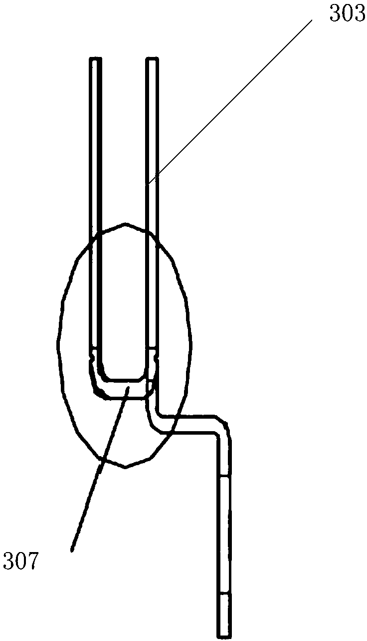 The ground part 301 since the splicing end 303 is bent downwards to form, and in the end part is formed with a through hole 306, the grounding part 301 through the through hole 306, by the bolt fixed on the vehicle body sheet metal. Specifically, the grounding part 301 from a ground terminal 303 is bent downwards to form, as shown in Figure 4, can be first extends downward to a certain position, then bent to extend in the horizontal direction, the horizontal direction after the extend a predetermined distance, extend a predetermined distance downward, thus forms the bending the grounding part of the 301, in actual production, the grounding part 301 can be formed connected with the inserting end of the 303 of the material is bent downwards to form.