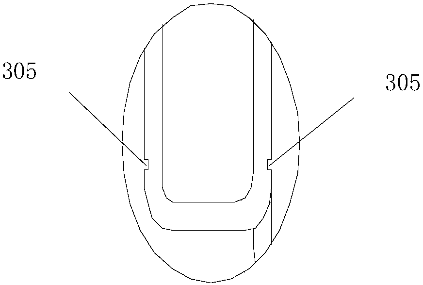 Further, as shown in Figure 5 and Figure 6, [...] structure comprises a along the length of the side of the substrate form in the direction of the strip-shaped groove 305 and is formed in the female connector 2 with the lower end of the inner side of the groove 305 is matched with the projecting part 202, in this way, when the ground terminal 3 from the parent end connector 2 is inserted into the lower end of the, ground terminal 3 will be card in the groove on the lug 202, so that the grounding terminal 3 is installed in the female end of the connector is clamped 2 on. In the utility model in another embodiment, the female connector 2 is formed at the lower end of the states peg grafting department corresponding to the shape of the cross section of the concave hole 201, said concave hole 201 formed at both sides of the said lug of the 202, such can be conveniently ground terminal 3 of the insertion and withdrawal. It must be noted that, the clamping structure of the utility model can also be other forms of structure, so long as they can realize the female connector 2 and ground terminals 3 can be connected between the.