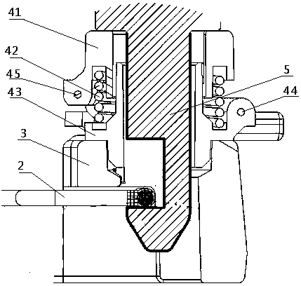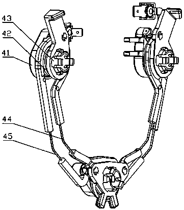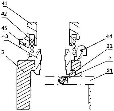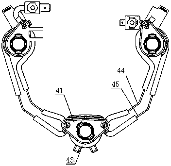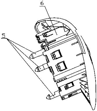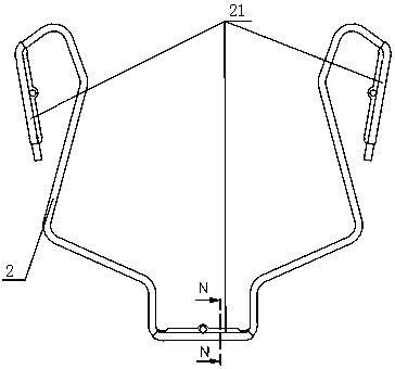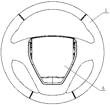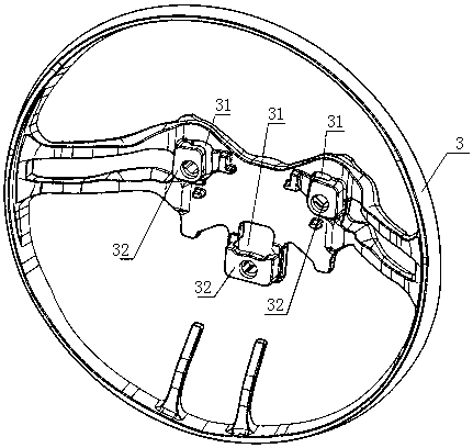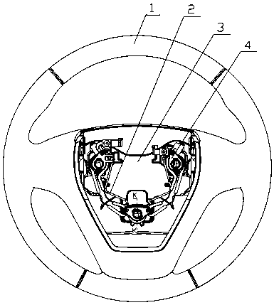 用于汽车方向盘上的浮动式喇叭机构技术领域本实用新型涉及汽车的部件,更具体地说涉及一种用于汽车方向盘上的浮动式喇叭机构。背景技术浮动式喇叭机构是汽车喇叭机构的主要形式之一。该结构形式不仅能实现喇叭按响功能,同时将方向盘与安全气囊模块有效地配合在一起实现对驾驶员被动安全保护的重要作用。浮动式喇叭机构,包括回位弹簧,当按压安全气囊模块时回位弹簧被压缩,触点上导电钢丝与下导电钢丝接触,喇叭回路导通,实现按响功能,当松开安全气囊模块时回位弹簧复位,触点处的上、下导电钢丝都分离,喇叭回路断开,按响停止。回位弹簧复位过程中导向卡钩与限位钢丝发生碰撞进而产生刺耳的金属撞击声,回位弹簧被压缩与复位过程中导向卡钩与导向孔发生摩擦进而产生 " 沙沙 " 的摩擦声。金属撞击声和摩擦声增加了驾驶仓内噪声水平,降低了乘坐舒适性。发明内容本实用新型的目的是提供一种用于汽车方向盘上的浮动式喇叭机构,以避免回位弹簧在被压缩与复位过程中产生噪声。本实用新型所述用于汽车方向盘上的浮动式喇叭机构,包括方向盘本体、限位钢丝、骨架、浮动式喇叭机构和设置在方向盘上的安全气囊模块,方向盘本体包裹在骨架上,安全气囊模块包括壳体和设置在壳体下表面的导向卡钩。所述浮动式喇叭机构包括上卡扣、回位弹簧、下卡扣、下导电钢丝和上导电钢丝,上卡扣注塑成型,并包裹在上导电钢丝上,下卡扣注塑成型,并包裹在下导电钢丝上;回位弹簧的一头卡接在上卡扣上,另一头卡接在下卡扣上,下卡扣卡接在骨架的安装点上。所述限位钢丝上设置有包覆层,限位钢丝通过包覆层卡入骨架的卡接口内。所述安全气囊模块的壳体扣在方向盘本体上,壳体的下表面抵压在上卡扣上表面,壳体上的导向卡钩伸入骨架内与限位钢丝的包覆层卡接,使包覆层限位在导向卡钩下端的钩状结构内。进一步,所述包覆层采用聚甲醛制成。聚甲醛具有很好的综合性能,是塑料材料中力学性能最接近金属的品种之一,其抗张强度、弯曲强度、耐疲劳强度和耐摩性十分优良,能在-40℃—100℃环境中长期使用。本实用新型所述用于汽车方向盘上的浮动式喇叭机构,由于具有上述结构,在回位弹簧在被压缩与复位过程中导向卡钩与包覆层发生碰撞,减小撞击部位和导向部位的摩擦而产生的噪声,提高了乘坐舒适性。附图说明图1为本实用新型的结构示意图;图2为本实用新型未安装安全气囊模块时的结构示意图;图3为本实用新型中骨架的结构示意图;图4为本实用新型中限位钢丝的结构示意图;图5为图4中沿NN线的剖面图;图6为本实用新型中浮动式喇叭机构的结构示意图;图7为本实用新型中浮动式喇叭机构另一角度的结构示意图;图8为本实用新型中安全气囊模块壳体的结构示意图;图9为图2中沿KK线的剖面图(未安装安全气囊模块);图10为图2中沿KK线的剖面图(已安装安全气囊模块)。具体实施方式为了进一步解释本实用新型的技术方案,下面结合附图来对本实用新型进行详细阐述。参见图1至图10所示,该用于汽车方向盘上的浮动式喇叭机构,包括方向盘本体1、限位钢丝2、骨架3、浮动式喇叭机构4和设置在方向盘上的安全气囊模块。方向盘本体1包裹在骨架3上。所述浮动式喇叭机构4包括上卡扣41、回位弹簧42、下卡扣43、下导电钢丝44和上导电钢丝45,上卡扣41注塑成型,并包裹在上导电钢丝45上,下卡扣43注塑成型,并包裹在下导电钢丝44上。回位弹簧的一头卡接在上卡扣41上,另一头卡接在下卡扣43上,下卡扣43卡接在骨架的安装点32上。所述限位钢丝2上设置有包覆层,包覆层采用聚甲醛制成。限位钢丝2通过包覆层卡入骨架3的卡接口31内。安全气囊模块包括壳体6和设置在壳体6下端的导向卡钩5。安全气囊模块的壳体6扣在方向盘本体1上,壳体6的下表面抵压在上卡扣41上表面,壳体上的导向卡钩5伸入骨架内与限位钢丝2的包覆层卡接,使包覆层限位在导向卡钩5下端的限位槽内。