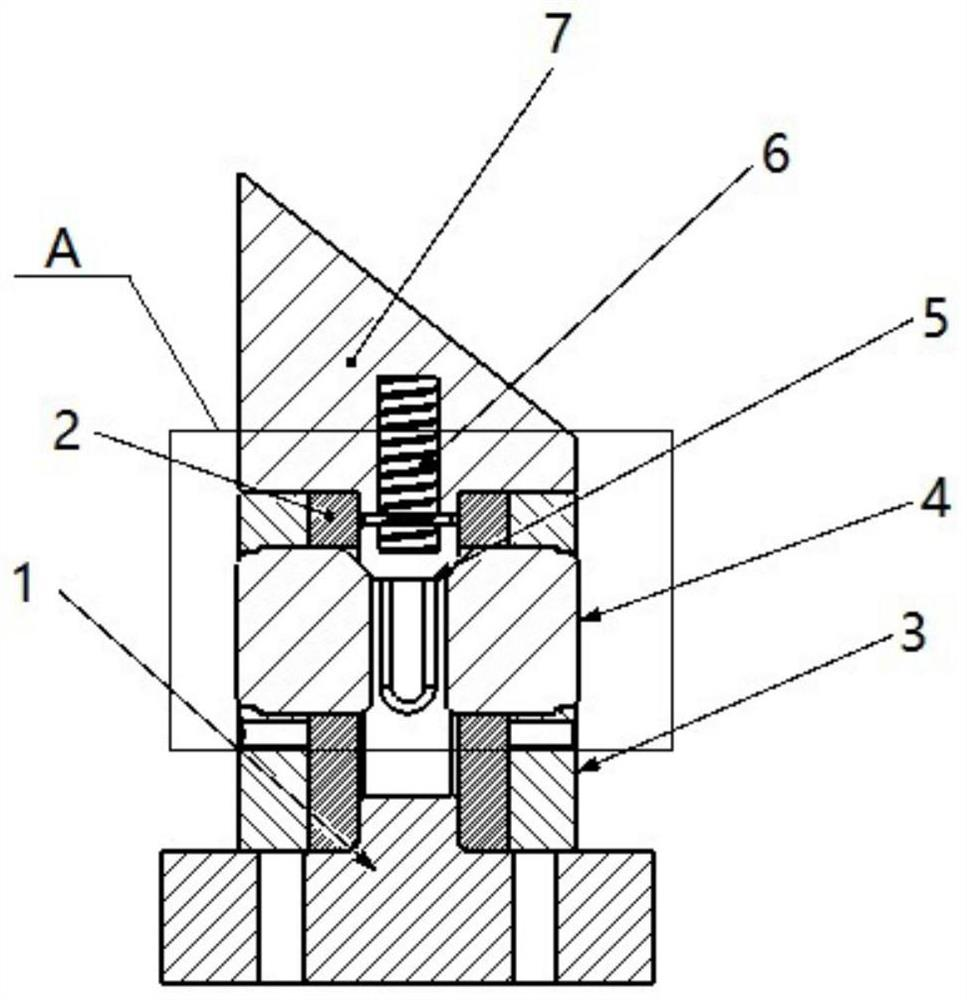 1 - Is shown 3. The center of the fixing block 7 is provided with a blind hole, and the open end of the blind hole is provided on one side of the lower spring pin pressing block 5. An elastic member 6 is disposed in the blind hole, an upper end of the elastic member 6 abuts against the fixing block 7, and a lower end of the elastic member 6 is connected to the pin pressing block. When the product needs to be compacted and fixed, the upper end of the self-centering multi-axis linkage internal expanding clamping mechanism is sleeved with the mandrel 2, and then the plurality of pin 2 distributed along the periphery of the mandrel 4 are simultaneously slid into the mandrel through hole 21 and ejected through the pin inclined surface 41 to the spring pin pressing block 5 5 to force the elastic member 6 5 to shrink and generate reverse pressure. The elastic member 6 presses the pin pressing block 5 under the reverse pressure, and the pin pressing block 5 transmits the reverse pressure to the pin 51 through the pin inclined surface 4, the plurality of pin 4 are forced to slide outwards, and the product is internally expanded to press and fix the product.