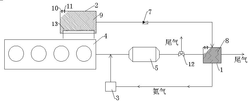 The Figure below to further illustrate the utility model as: as shown in Figure 1-3, solid the ammonia uses chu ammonia material ammonia gas automatic supply system, by the use of an the main material container 1, use of an material supply container 2, DCU reductant metering control unit 3, engine 4, SCR catalytic converter 5, use of an electric heating unit material 6, check valve 7, the main container stored ammonia material 8, supply container can be stored in the ammonia material 9, the temperature sensor 10, pressure sensor 11, the exhaust gas of the three-way valve 12, the engine cooling system 13 a, characterized in that the engine 4 with the SCR catalytic converter 5 connected in parallel on the exhaust gas line of a use of an material of the main container 1, use of an the main material container 1 in parallel with the exhaust pipe arranged on the pipeline of a DCU reductant metering control unit 3, ammonia material of the main container 1 the rear end of the ammonia material connected in series with a supply container 2, ammonia material of the main container 1 with the use of an material supply container 2 connected with the one-way valve is arranged on the pipeline 7, use of an the main material container 1 is filled with the main container stored ammonia material 8, ammonia material supply container 2 is filled with the supply container can be stored in the ammonia material 9, ammonia material the main container 1 and ammonia material supply container 2 on the container are set with use of an electric heating unit material 6, use of an material of the main container 1 and ammonia material supply container 2 is arranged in the top of the temperature sensor 10 and the pressure sensor 11.