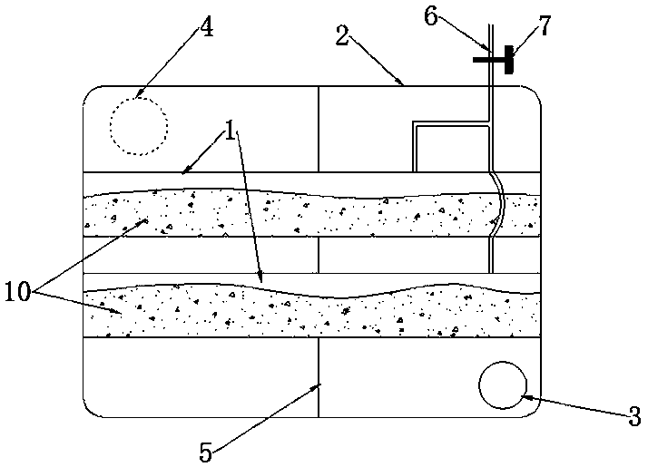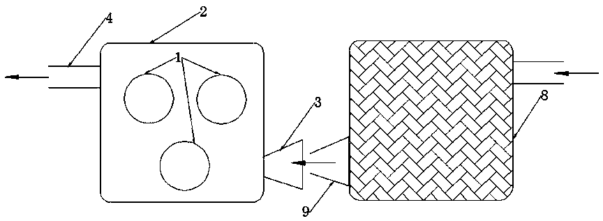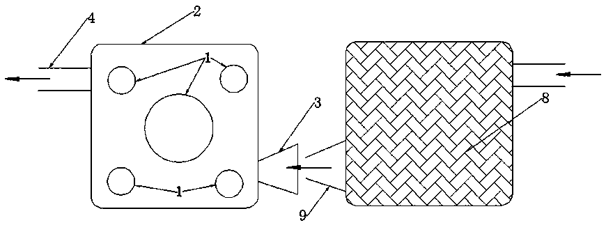The Figure below to further illustrate the utility model as: as shown in Figure 1-3, a multi-tank integral full heat SSCR module and a heat removal device, by the [...] 1, integral full heat SSCR module taking heat from the casing of the device 2, the air inlet of the heating device the exhaust gas 3, heating device exhaust gas outlet 4, the stationary partition 5, the ammonia gas outlet pipe 6, angle valve 7, the exhaust gas post-processor 8, the outlet of the exhaust gas after the processor 9, solid ammonia material 10 a, characterized in that two [...] 1 is arranged in the entire hot -like SSCR module taking heat from the casing of the device 2 in the middle of the, two [...] 1 are arranged up and down, two [...] 1 through the middle position of the fixed baffle 5 support, [...] 1 the two ends of the through an integral full heat SSCR module taking heat from the casing of the device 2 two side end plate sealing, ammonia gas outlet pipe 6 the two [...] 1 connected in parallel, the ammonia gas outlet pipe 6 opening in the outlet end of the whole heating SSCR module taking heat from the casing of the device 2 the top surface, the ammonia gas outlet pipe 6 connected to the canted valve outlet end of 7, from the heat of the exhaust-gas outlet 4 open throughout the heating SSCR module taking heat from the casing of the device 2 of the upper-left, and a heat removal device exhaust air inlet 3 is opened in the full heating SSCR module taking heat from the casing of the device 2 of the lower right corner, and a heat removal device end gas inlet 3 to the trumpet shape, exhaust gas after the processor 8 of the outlet of the exhaust gas after the processor 9 with the heat removal device end gas inlet 3 butt; an ammonia material 10 is filled in the [...] 1 in.