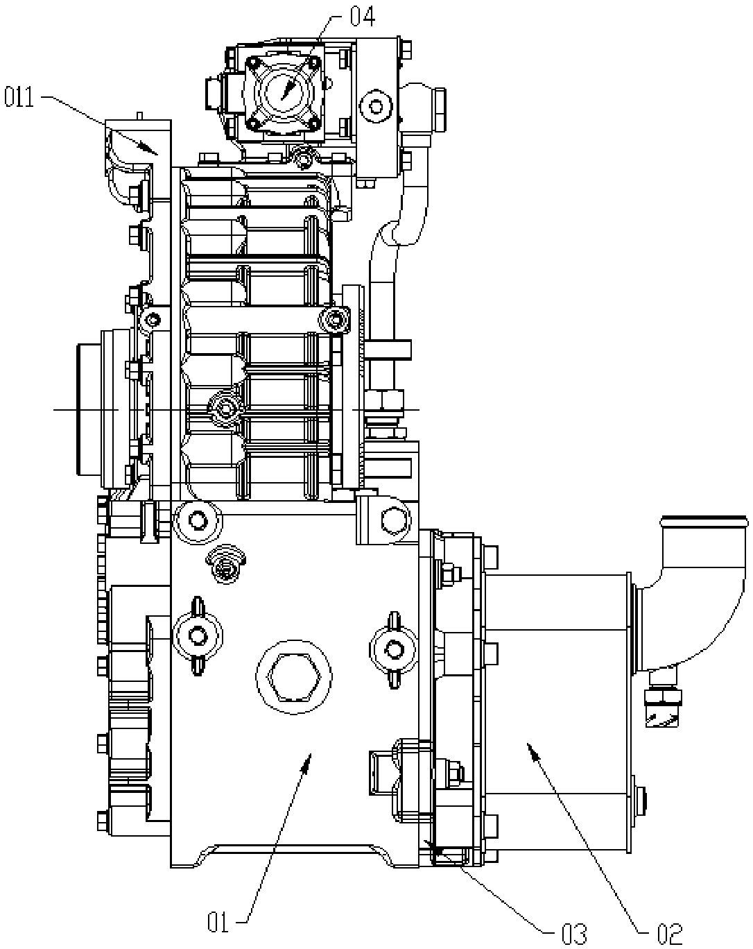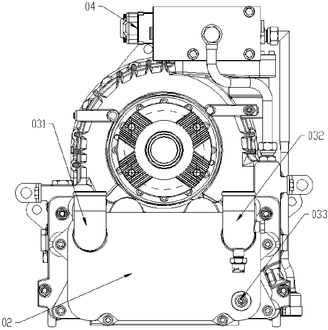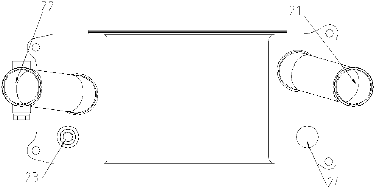 技术领域 本发明涉及汽车缓速器技术领域,具体涉及一种串联液力缓速器。 背景技术 液力缓速器作为整车辅助制动装置中重要的一种,以其省油耗,质量轻,制动效能 高,无热衰退的优点,在欧洲已完全取代了电涡流缓速器。前期液力缓速器在我国,只限于 部分高等院校和科研单位进行理论研究,实物的研发进展缓慢。 现有的串联液力缓速器通常包括缓速器外壳、缓速器定子、缓速器转子、电磁阀总 成、输出法兰盘和热交换器总成,缓速器外壳给定转子工作提供空间;缓速器定子固定在缓 速器外壳上,叶片方向和转子相反;缓速器转子通过花键和变速箱的输出轴相连,随着输出 轴转动;电磁阀总成通过内部阀芯开度的大小从而控制进气气压的多少,进而控制缓速器 产生的制动力大小;热交换器总成将工作油液产生的热量传递给整车的防冻液。 液力缓速器工作时,缓速器从整车气源取气,气体经过电磁阀总成,调节到一定压 力之后,通过进气通道进入缓速器外壳内的油池,油池内的工作油液在压力作用下通过缓 速器壳体内部循环油道进入到定转子工作的独立空间内。 缓速器空心轴通过与变速箱输出轴相连将转速传到转子上,从而搅动进入定转子 之间的油液,进而将油液打到定子上,由于定子和转子的叶片方向不同,从而定子会将油液 反方向打到转子上,给转子一个反方向的作用力,通过转子传到空心轴上,进而传到法兰 盘、传动轴上,最终形成对整车的制动力;整车的动能最终转化成工作油液的热能。 为了避免油液温度过高,油液热能需要整车的散热系统进行散热,而热交换器总 成就起着将工作油液产生的热量传递给整车的防冻液的作用,这样就需要油液进入到热交 换器总成内,同时需从整车连接水管到热交换器总成的进出水管,使整车防冻液进入到热 交换器总成。工作油液从壳体的出油口不断流入热交换器总成的进油口,同时整车冷却液 经热交换器总成进水管流入热交换器总成,将油液热能带走,经热交换器总成出水管带到 整车散热系统进行散热,从而给液力缓速器油液降温。 2002年6月,交通部颁布行业标准JT/T325-2002《营运客车类型划分及等级评定》, 该标准规定中型客车中高二级,大型客车中高一级、高二级和高三级客车都必须装置缓速 器。2002年10月建设部公布执行的CJ/T162-2002《城市客车分等级技术要求与配置》也规定 超二级、超一级、高级的市区和城郊城市客车规定必须装配缓速器。 2012年6月,发布的GB7258-2012《机动车运行安全条件》规定车长大于9m的客车、 总质量大于等于12000kg的货车和专项作业车、所有危险货物运输车,应装备缓速器或其他 辅助制动装置。 上述一系列法规的出台,以及整车厂、终端用户对安全重视程度的加强,为国内液 力缓速器市场的形成和发展创造了良好的环境。 在此期间,市场上相继推出了FH400B、FHB320B、FHB360等几款液力缓速器,但这些 产品都是基于重型货车以及12m以上的大型客车匹配设计的;如图1、图2所示,其外部结构 主要包括缓速器壳体01、缓速器盖011、热交换器壳体02、热交换器支架03以及电磁阀04,热 交换器壳体02上设有进水口031、出水口032及放油口033。上述产品一经推出很快得到广大 主机厂和用户的认可。但是此类液力缓速器一般具有体积大、重量大、扭矩大的特点,且检 修操作繁琐、费时费力,价格也较高;不适用于中重卡、9~11m的客车、中卡、部分军用运输 车、送货用单厢货车和饮料运输车等车型。 发明内容 本发明的目的是针对现有缓速器整体结构尺寸、重量大,零件多,检修操作繁琐、 费时费力等问题,而提供一种串联液力缓速器。 为实现上述目的,本发明提供的技术方案是:一种串联液力缓速器,包括缓速器壳 体和热交换器壳体,其特殊之处在于,所述热交换器壳体相对于缓速器壳体的外壁上设有 进水管和出水管,进水管和出水管呈 " 八字 " 形布置,所述缓速器壳体设有与所述进水管和 出水管对应的通孔,通孔的直径大于进水管和出水管的外径;热交换器壳体上呈 " 八字 " 形 布置的进水管和出水管伸入缓速器壳体相应的通孔内,环抱缓速器壳体设置。 热交换器壳体设置形式的不同有效缩短了缓速器轴向安装距离,有效缩短了缓速 器的轴向尺寸;减少了因水管高度增加的缓速器整体轴向距离。进、出水管可顺利穿过缓速 器壳体的铸造通孔,减少了热交换器进出水管的距离,缩短了缓速器整体的横向尺寸,更方 便空间相对小的整车布置。 进一步地,上述缓速器壳体包括壳体压盖和壳体本体,壳体压盖与壳体本体通过 螺栓连接后形成油池。既能确保壳体本体的铸造质量和加工精度,便于安装,还有利于降低 制造成本。 进一步地,上述壳体本体设有四个凸台,凸台上设有螺纹通孔;热交换器壳体上设 置与四个凸台位置对应的通孔,采用螺栓穿过通孔和凸台将热交换器壳体与缓速器壳体连 接。去掉了现有缓速器壳体和热交换器壳体之间的连接支架;减少了零件数量,减轻了缓速 器的重量。 进一步地,位于缓速器壳体下部的两个凸台上分别开设有第一进油口和第一出油 口,热交换器壳体上对应设置第二进油口和第二出油口;第二出油口对接第一进油口后,经 单向阀与油池连通;第二出油口和单向阀之间循环进油道的管壁与壳体本体的外壁通过螺 纹孔连通;螺纹孔内可拆卸地设置用于放油的螺纹堵头。 进一